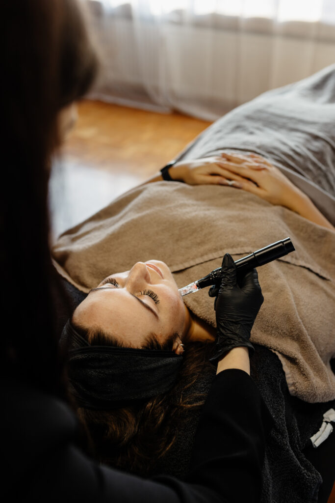 Die Haut wird zuerst tief gereinigt und vorbereitet, anschließend gezielt zur Regeneration und Kollagenbildung angeregt.